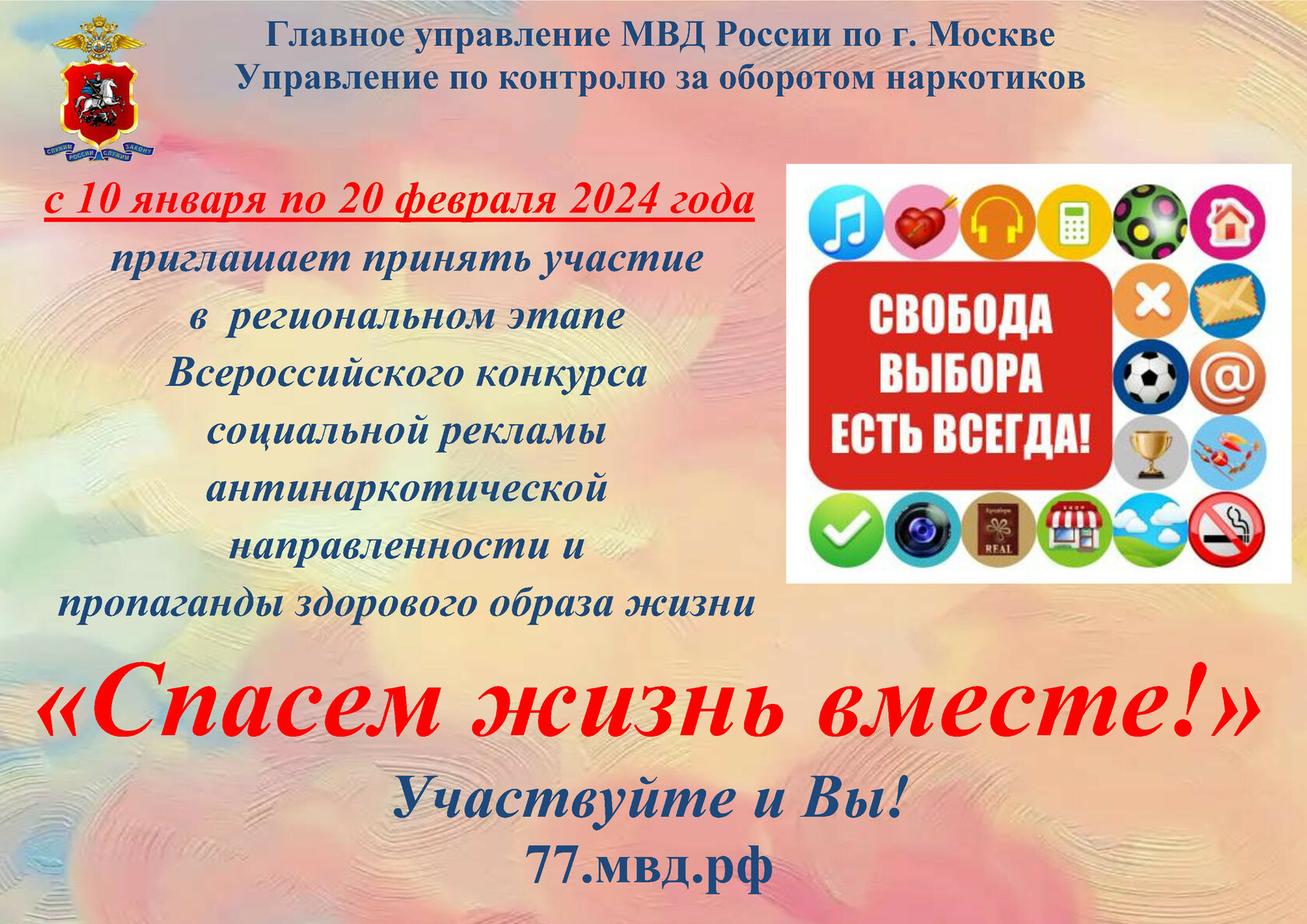 В период с 10 января по 20 февраля 2024 года на территории города Москвы пройдет региональный этап Всероссийского конкурса социальной рекламы антинаркотической направленности и пропаганды здорового образа жизни «Спасем жизнь вместе!».